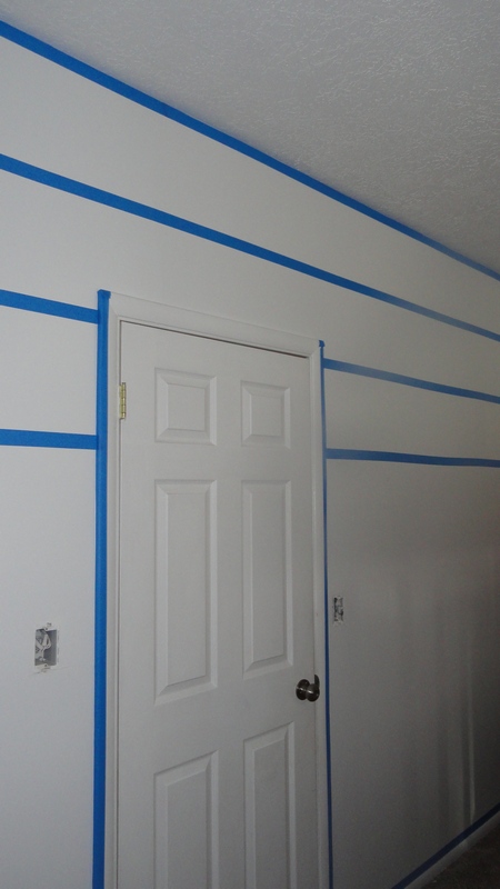 We worked as a team at this point. David marked the walls, and I stuck the tape on the walls. Since our house was built in 1940s, the walls are not perfect. So we had to do it by hand and kind of play with it a bit so it looked good. haha! Gotta love old homes!!!