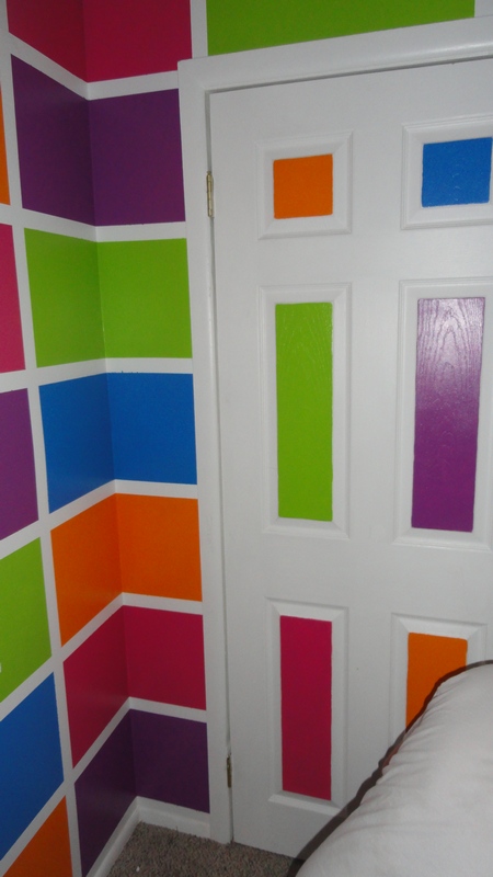 We have been contemplating how to do the girls room for awhile. We knew we wanted something bright and alive. We looked all over the internet for ideas. And we found the perfect one! We chose to do bright colored rectangles. We loved the idea! So here is the journey we took to create this amazing room for our little nerdlets. Now keep in mind we spent months doing this, so it was time consuming. But in our defense we also had Christmas and a Wedding to work around. Here we go!